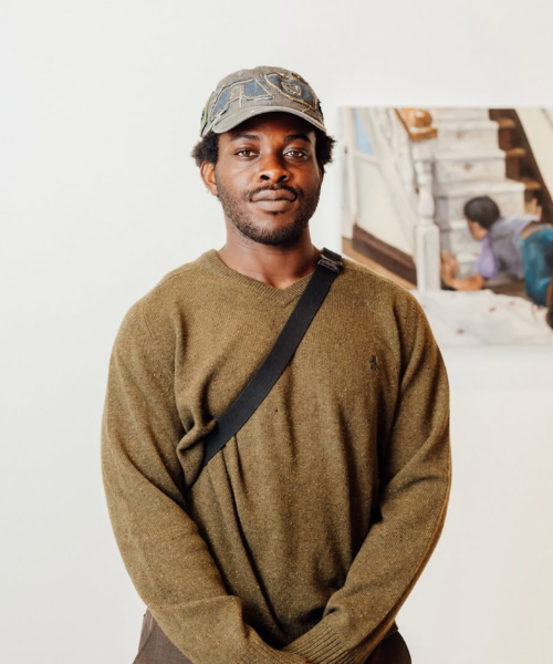 Okey Ofomata’s (b. 1997, Los Angeles, CA) paintings delve into a deeply introspective and multifaceted exploration of narrative and mood, intertwining personal history with broader social commentary. The artist’s process begins with crafting narratives that span diverse locations and ideas, unified by common thematic threads. Drawing from a rich array of references—including films, literature, and personal observations—Ofomata creates works that traverse emotional landscapes marked by frustration, anxiety, reflection, and introspection. This emotional spectrum is balanced against settings that contrast the figures’ states, allowing moments of satire and reflection to emerge.